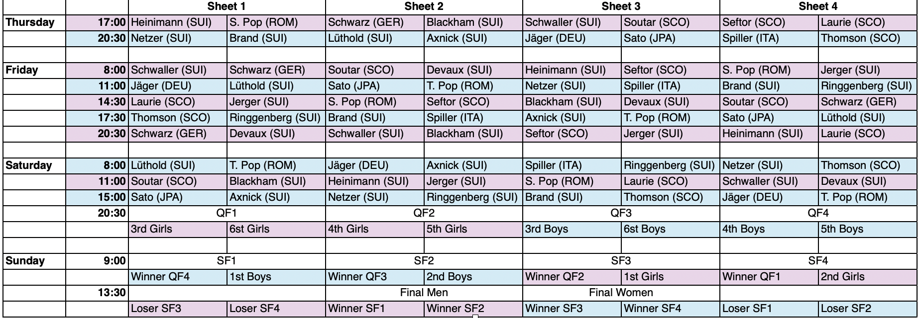 At least one game per round will be streamed and/or broadcast on linear TV on Swiss-Sports TV. Results will be published live on CurlingZone.com and in the Rinkmaster.